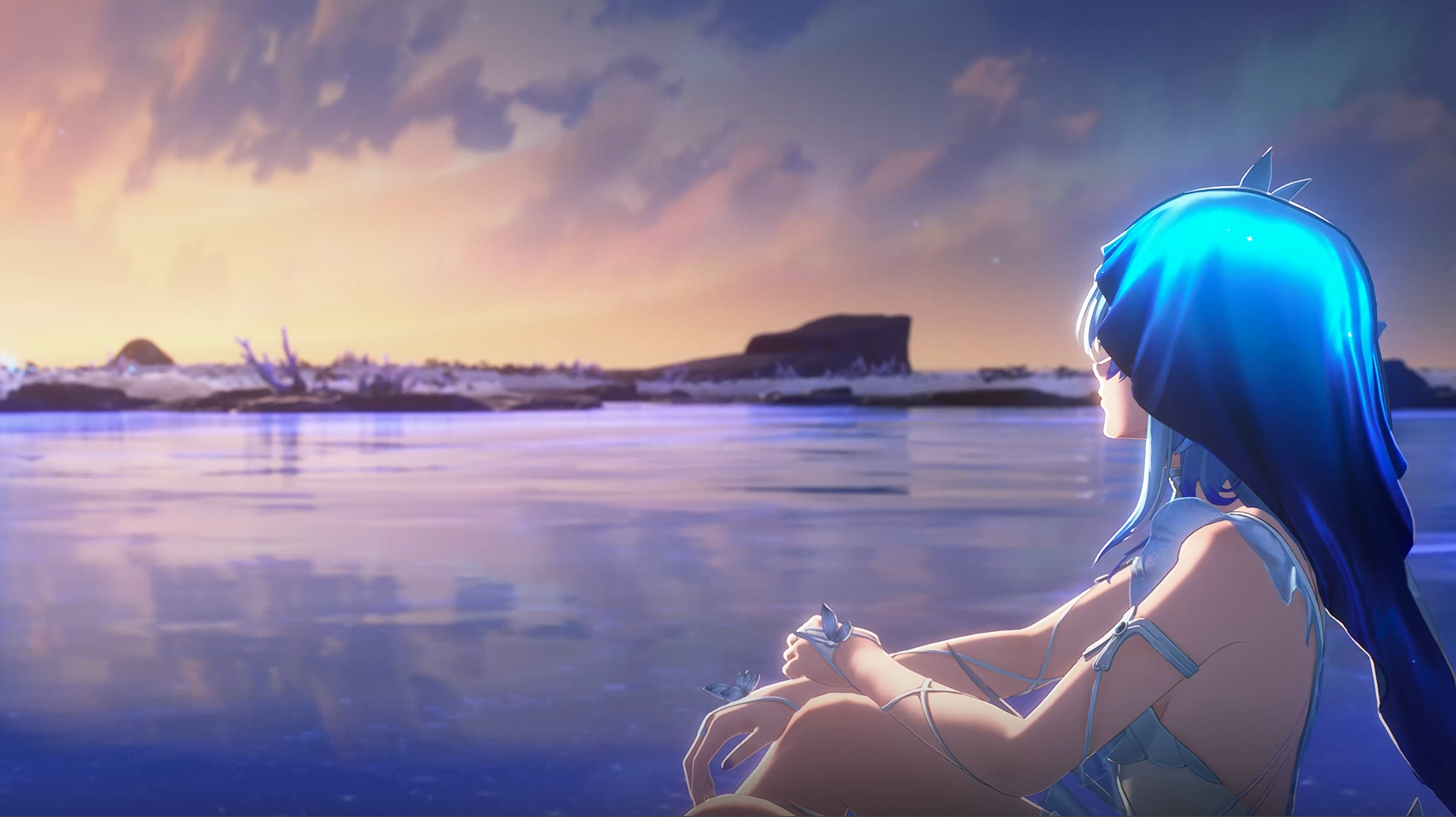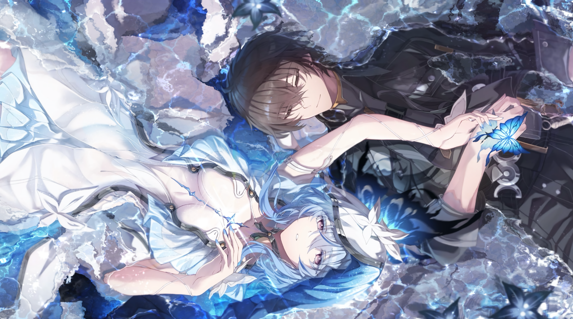 명조 공식 영상 파수인 PV에서 확인할 수 있는 2D 전환씬 장면입니다. 한눈에 들어오는 검은 해안과 파수인의 상징인 나비가 어우러진 분위기가 압도적이며, 물결이 흔들리는 연출과 파란색 나비들이 날갯짓을 하는 모션, 뒤에 비친 눈 감은 파수인의 모습과 중앙에 있는 하얀 파수인 캐릭터의 모습까지 눈길을 사로잡는 배경화면입니다. 일정 구간 되감기가 들어간 월페이퍼라서 무난하게 사용할 수 있겠습니다.
