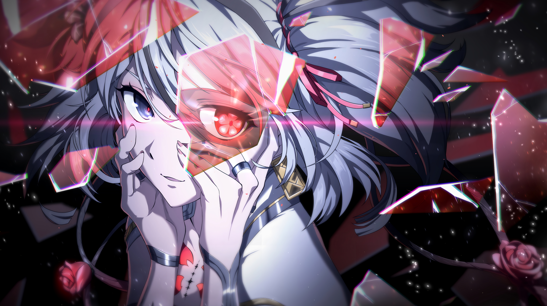 이 카멜리아의 일러스트는 깨진 유리에 한쪽 눈만이 붉게 빛나는 것이 개인적으로 마치 도쿄구울의 척안을 연상시키는 듯한 느낌이 들었던 배경화면입니다. 유리에 비치는 눈빛이 굉장히 인상적이고 자연스러우면서 주변에 흩날리는 이펙트도 크게 부담스럽지 않게 잘 녹아든 모습입니다. 이펙트를 끄는 기능이 없는 게 한 가지 아쉬운 점이네요.